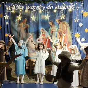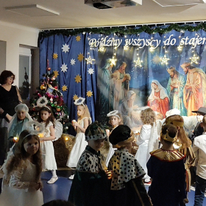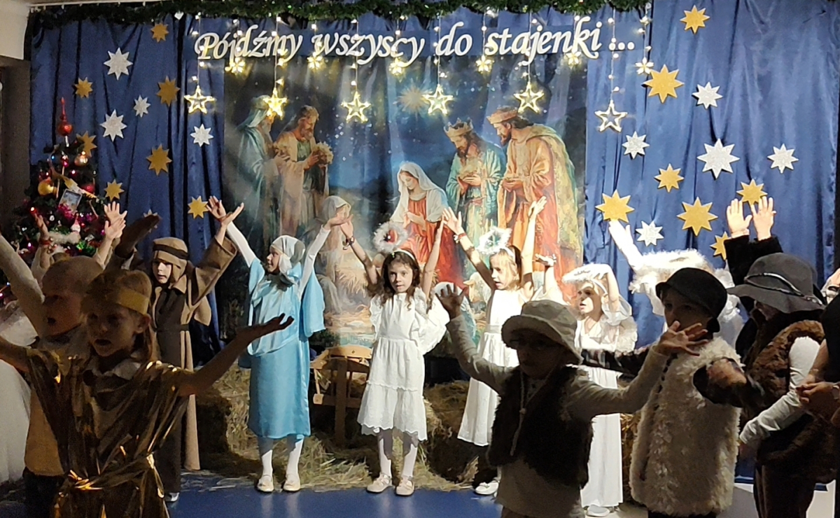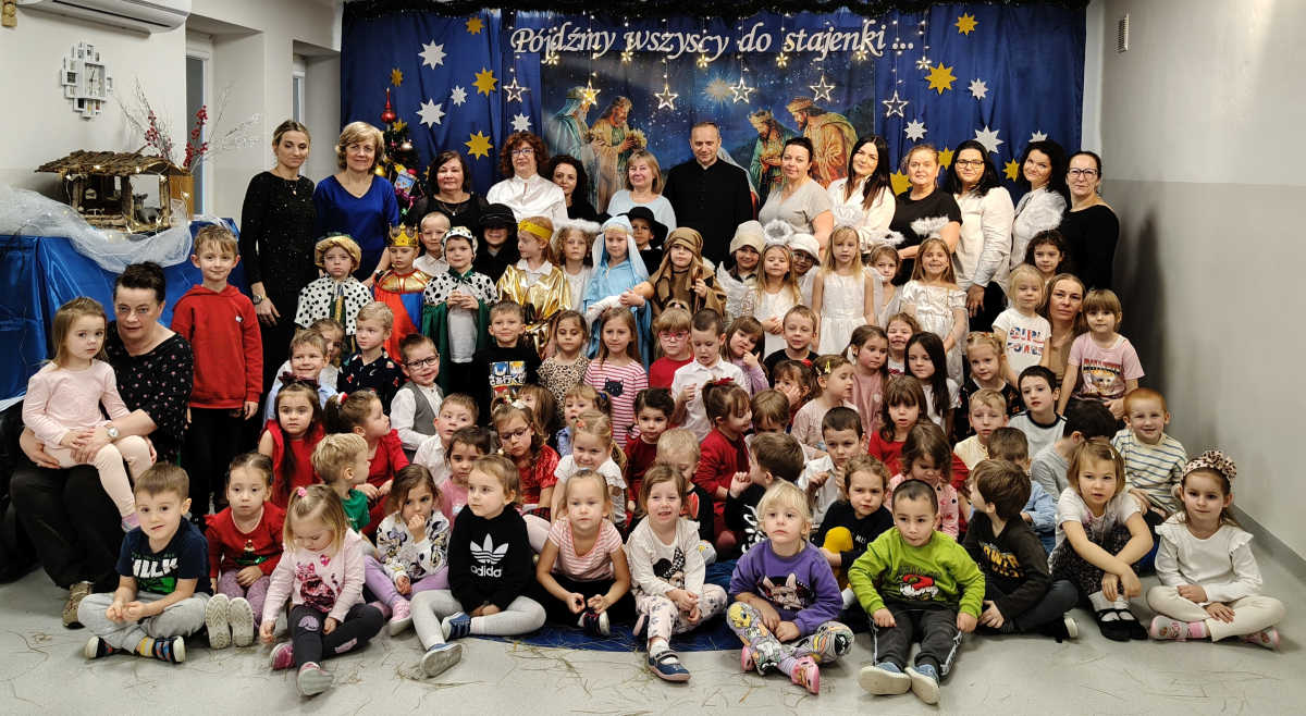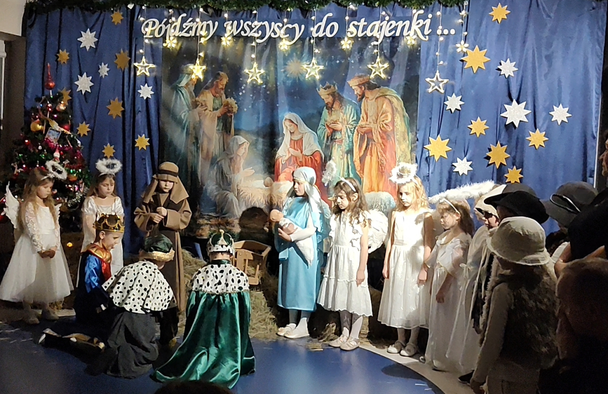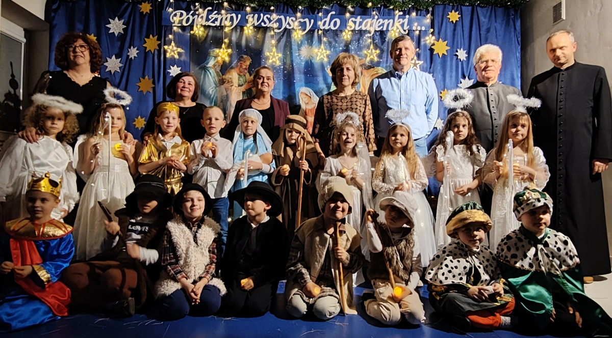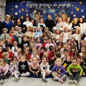 O tegoroczną bożonarodzeniową atmosferę zadbała grupa „Żabki”, która w dniu 18 grudnia zaprezentowała Jasełka pt. „Pójdźmy wszyscy do stajenki”. Przedstawienie zostało przygotowane dla rodziców oraz zaproszonych gości: Pana Grzegorza Ordona – Dyrektora Biura Obsługi Jednostek Samorządowych oraz Proboszcza Parafii pw. Podwyższonego Krzyża, księdza kanonika dr Andrzeja Zarzyckiego. Dzieci zaprosiły również swoich bliskich do wspólnego kolędowania, zachęcając rodziców i gości do aktywnego udziału w uroczystości. Wspólnie śpiewane kolędy stworzyły niezwykle ciepłą, rodzinną atmosferę, sprzyjającą wzruszeniom, radości i integracji całej społeczności przedszkolnej. Był to moment pełen uśmiechów, który na długo pozostanie w pamięci zarówno dzieci, jak i dorosłych