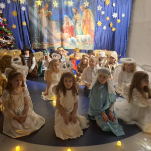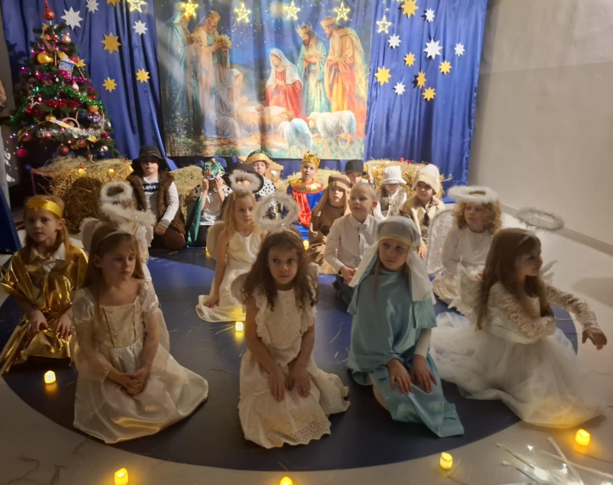 Sala przedszkolna na ten wyjątkowy dzień przemieniła się w salę koncertową, udekorowaną piękną, świąteczną scenerią. Z ust małych i dużych wykonawców rozbrzmiewały polskie kolędy, którym towarzyszył akompaniament gitary księdza Mateusza Woszczyna. Na zakończenie spotkania nie zabrakło świątecznych pierniczków, pasztecików oraz tradycyjnego barszczyku. Mamy nadzieję, że wszyscy uczestnicy poczuli magię nadchodzących Świąt Bożego Narodzenia.